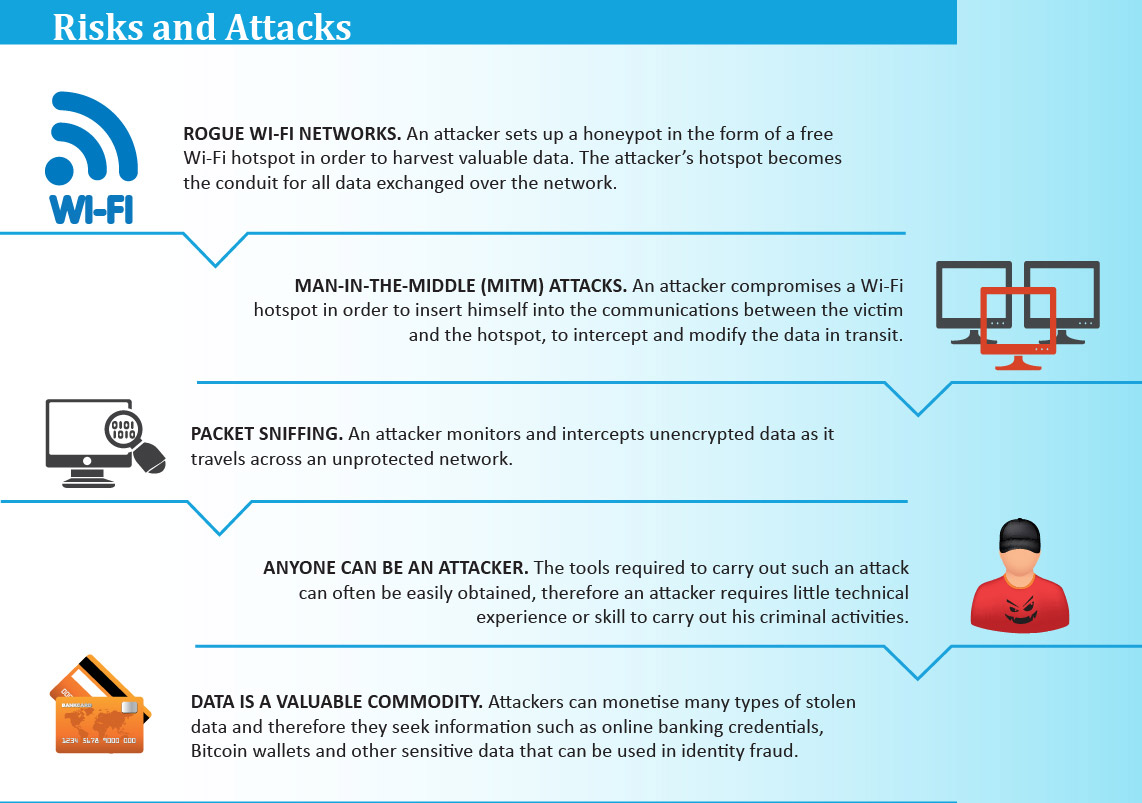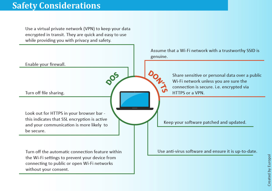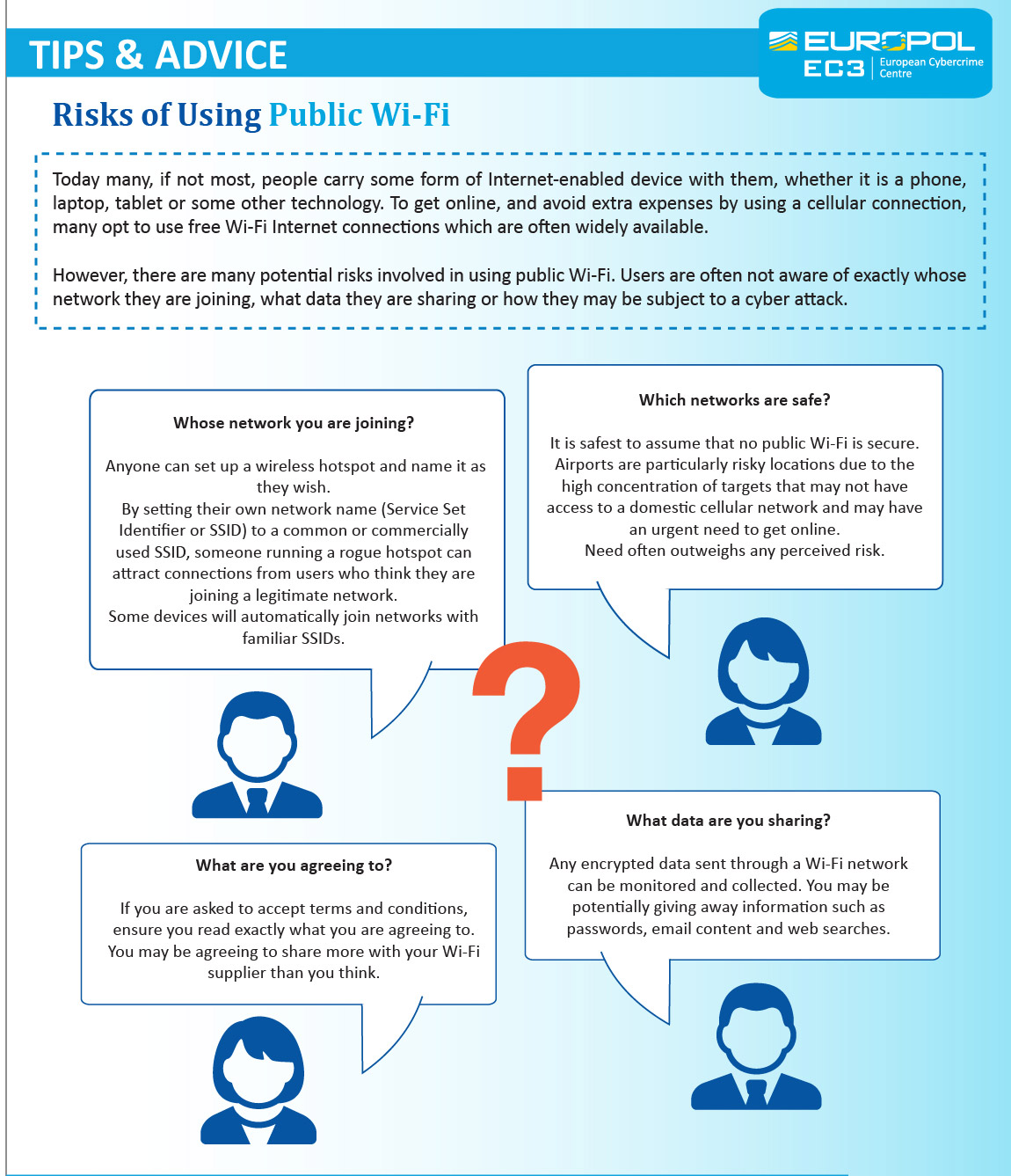 This page offers advice from EuroPol's notices on the dangers of using unsecured public Wi-Fi networks.